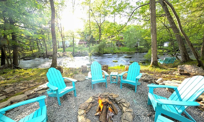Welcome to our lovely Poconos River House located in Saw Creek Estates! The perfect escape for your family with fantastic amenities right here in the community and close proximity to so many Poconos attractions! We are located on the edge of the community on a dead end street with a flowing stream in the back, which allows for a secluded and tranquil getaway