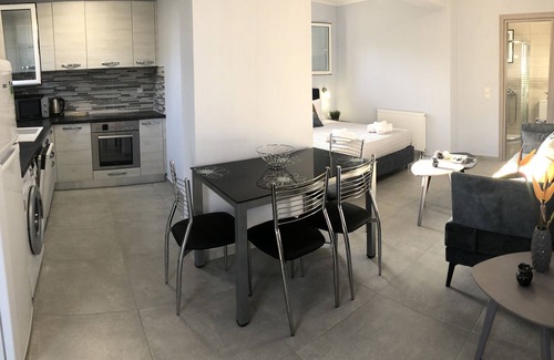 It can accommodate 2-3 guests, it has an open setup with a queen size bed and comfortable sofa. The kitchen is fully equipped with a large fridge / freezer , an oven with ceramic stoves, washing machine, dishwasher, microwave, toaster, coffee machine , kettle etc