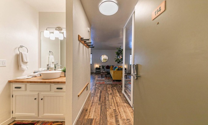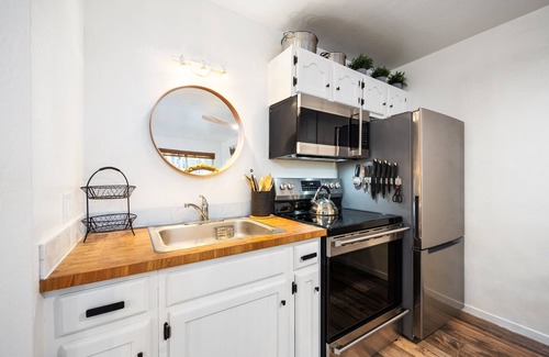 This modern and beautifully decorated unit is located on the first floor and includes a Queen-size bed and a Queen-size pullout sofa sleeper with a memory foam mattress and a support board, which makes this sofa sleeper very comfortable. You won't feel those uncomfortable metal bars on your back. This unit has a kitchen with a 4-top stove and oven, a sink, a full-sized refrigerator, an espresso coffee maker, a microwave, a table with four stools, and the necessary items to cook a meal. It also has a 55” flat-screen smart TV and is conveniently located near our laundry facility.
