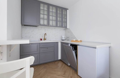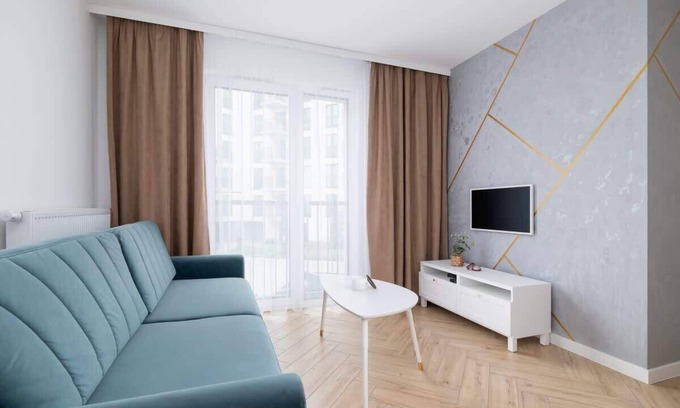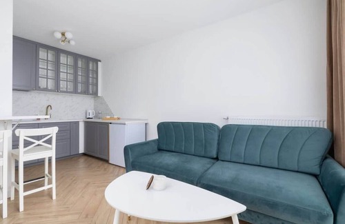 This bright and comfortable apartment can accommodate 4 people. It consists of a living room with kitchenette, a bedroom and a bathroom with shower. It is an excellent choice for travellers who do not want to compromise on style and comfort. The interior colour scheme and quality furnishings enhance the atmosphere of the apartment. The living area, equipped with a comfortable sofa and a Smart Tv with cable channels, is the perfect place to relax and unwind. The bedroom has a very comfortable double bed and a desk and chair - a place to work or study. In addition, the kitchenette is equipped with high quality appliances that allow you to prepare your favourite meals. The wide range of amenities and the fact that the apartment is fully equipped with all the necessary kitchen and bathroom accessories and equipment guarantee a comfortable stay. The apartment is meticulously finished and the modern and beautiful design is sure to satisfy the aesthetic sense of guests. A complimentary set of toiletries (soap, shampoo and shower gel), towels and bed linen are provided to facilitate the start of each stay. The apartment has access to free high speed wifi internet. Guests travelling with pets are also welcome as this is a pet friendly apartment (100 PLN/stay). The apartment also has a parking space in the garage, which is a great advantage during the holiday season.