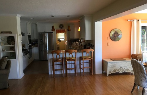 Beautifully decorated 4 bedroom 4 bathroom private home. Two private screened in porches with a large open second floor deck. House is canal front with an open solar heated pool.Great fishing or relaxing from a private dock. Fishing poles supplied if needed. Enjoy stunning sunsets while sitting comfortably in the backyard. Close to downtown Stuart(5 minutes)and restaurants beaches. Walking distance to a golf course. Shopping mall,Publix, and Wine Outlet down the road . The First Floor master bedroom has a queen bed and private new bathroom. Second floor master bedroom with a king bed,private deck and bathroom .Third bedroom with queen size bed .Fourth bedroom with 2 twin size beds .Pullout sofa bed in downstairs living room.Fully stocked kitchen with everything you could possibly need. Dinnerware for 15+ and much more. Spices, paper product. Close to both Jensen and Stuart Beaches and restaurants. Private neighborhood with beautiful Scenic walking paths and a golf course down the street. Don’t forget to to catch beautiful sunsets on the canal while lounging in your private pool.Beautiful front porch sitting area, there is a ring doorbell camera at front door when walking in to house . The garage is not accessible to renters.