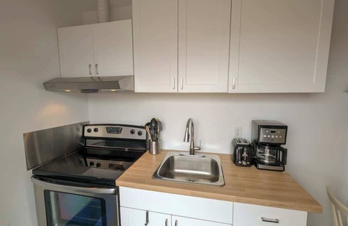 Ce charmant studio de style chambre d’hôtel, situé au rez-de-chaussée, offre un espace chaleureux et confortable. Il dispose d’une cuisinette, d’un coin travail, d’une télévision intelligente, d’une table à manger, ainsi que de deux lits queen pouvant accueillir jusqu’à 4 personnes.