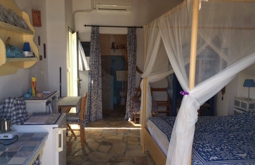 Mini apartment on the first floor with sea and beach view, double bed, bathroom and small terrace overlooking the sea. Kitchenette with electric cooker and fridge. The entrance to the apartment is from the beach. Next to the house there is a bar with umbrellas and a cafeteria and toast beach service. Clear sand beach and turquoise sea. Ideal for those who love Spartan life .... only necessary: slippers, swimsuit and a few comfortable clothes. Island for lovers of excursions and the sea. The beach is not private so in the months of July and August it is quite popular. This studio can be associated with studio 2 therefore for 4 people by renting both.