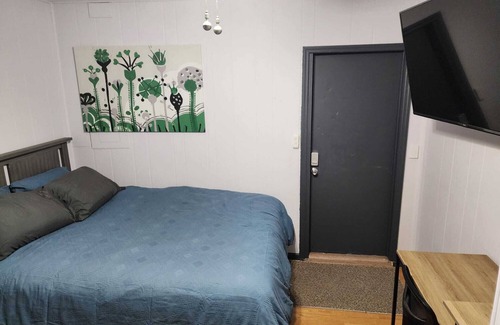 This studio apartment is attached to a home and has it's own entrance. Don't worry about being with other roommates because you have your own fridge, cook top, microwave, and bathroom. The thermostat is controlled by the main house, but we do offer a window unit to increase the AC if you would like.