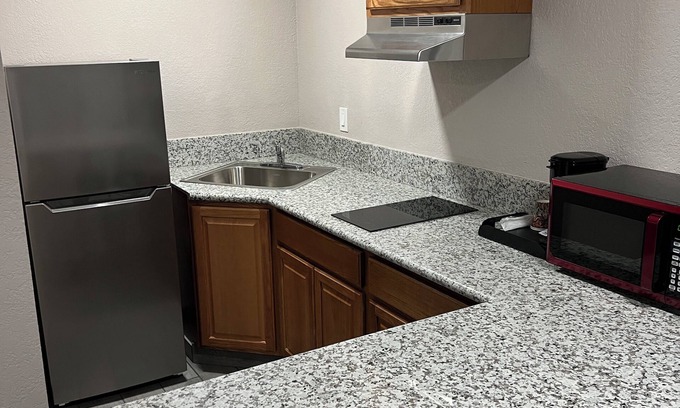 Clean and Spacious Studio Apartment! This is a private apartment with a king bed. It includes a small kitchen with an electric cooktop, refrigerator, microwave, and cabinet storage. Kitchenware is not provided to keep our rates as low as possible. We also have onsite staff that can assist with any issues during the stay. If you are staying with us for an extended period, we do have complimentary House Keeping services at no additional cost to you!