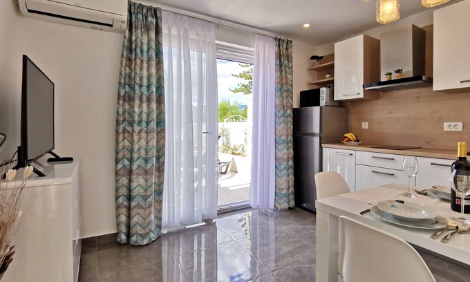 Studio flat can accommodate 2 guests. Beds are situated in 1 sleeping rooms, within 24m2. Guests can use a private terrace to enjoy the warm summer evenings. The studio offers the sea view. Food can be prepared using barbecue which is shared with other guests too.