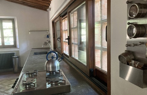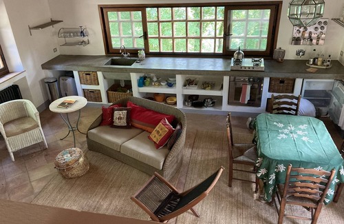 The studio has a large sitting room with table seating four and concrete kitchen table running the length of the south-facing window which slides open with traditional brick lattice screen and view of the green jungle-like woods, cosy in winter and cool in the hot summer months. The double bed (135cm wide) is on a balcony surrounded by shelves in which to store clothes. Chinese screens close the walled cupboard. The bathroom has concrete shower floor with large shower-head and concrete table with Philippe Starck basin. Through the window you see the oval-shaped concrete table outside waiting for a large party of people to enjoy their meal shaded by an old chestnut tree with the olive grove beyond and the pool on a higher terrace. Play your favourite music resounding as in this mini concert hall and enjoy the wood-burning stove crackling in winter while you relax on winter evenings after a day exploring the area.