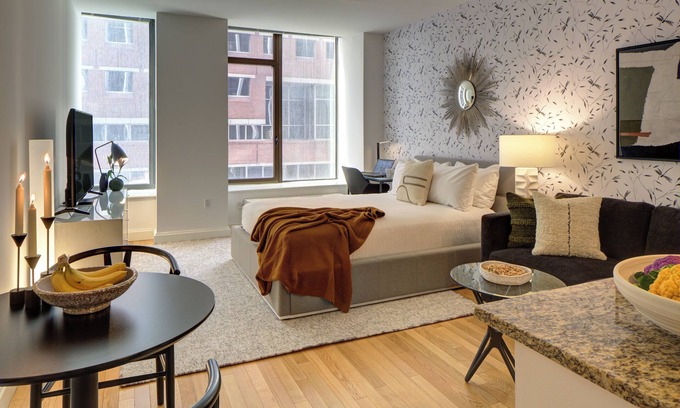This modern studio in the Financial District features hardwood floors, granite countertops, stainless steel appliances and an in-unit washer/dryer. All beds provided are fitted with plush linen sheets and pillows. All Furnished Quarters apartments include 24/7 guest service.