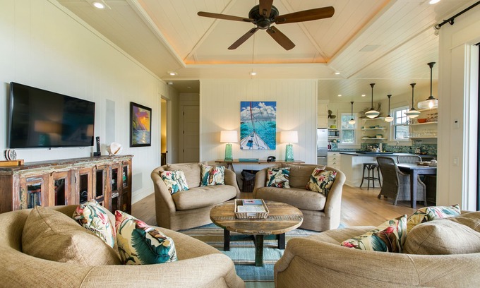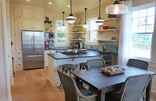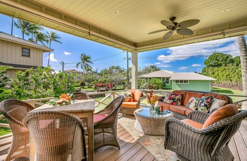 This spacious house was designed and built in 2013 to be the perfect vacation retreat - its plantation style allows it to blend in with the historic neighborhood, while offering every modern luxury. Outside is a barbeque grilling area, a garden shower accessible from either the master bath or from outside, and under the Plumeria Tree is a landscaped 5 person hot springs style hot tub. Enjoy the 2 master, air conditioned, suites with plush king beds, flat screen TVs, pedestal tub, and outdoor garden shower, and full size front load washer and dryer. The open plan great room opens up to the large lanai with 22 feet of 8' high folding doors, and the 9 1/2 foot high walls, vaulted ceilings, large double hung windows, and ceiling fans keep the place breezy and cool. Both bedrooms are air conditioned to keep you comfortable all night long. The kitchen is equipped with a full sized french door refrigerator, whisper quiet dishwasher, gas range, walk-in pantry, granite counters, open shelving, and fully stocked. The sound system through out the living area as well as the lanai is set up for surround sound TV watching, listening to Pandora, or you can wirelessly listen to your own music collection from your smartphone. If you find us all ready booked, consider our house next door!
