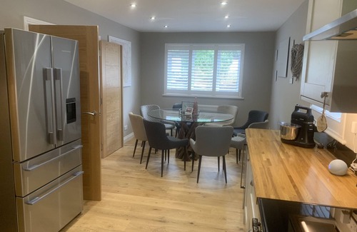 On the ground floor, we have a large entrance hall with digital piano - great for experts or novices. Double doors open from the hallway into our large dining kitchen, with a beautiful glass topped teak root table seating 8 (inspired by TV's Saturday Kitchen!). We have a fantastic, simple to use electric Aga with induction hob, large French fridge freezer with water dispenser and automatic ice maker, dishwasher, filter coffee machine, food mixer, kettle, toaster, microwave. Excellent, quality range of crockery, cutlery, pans, serving dishes etc makes it a pleasure to eat at home if you prefer during your holiday.