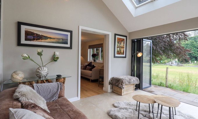 The living room opens up into our favourite room - the garden room, which has double bi-folding doors with super views across the field, the West Windermere Way footpath, and Cartmel Fell in the distance. The garden room then opens onto our large patio, with dining furniture and Weber BBQ. Gorgeous walks from the door. The beautiful lake of Windermere is 2 minutes across the road (to avoid confusion, we have field, woodland & fell views but only a small glimpse of the lake).