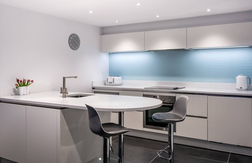 The luxury Lake District cottage is centrally heated and comprises: Contemporary open plan living area with under floor heating, wall mounted Smart TV, Bluetooth iPod dock, corner sofa and bi-fold doors with remote controlled blinds. Kitchen area has breakfast bar and seating for two, electric oven and hob, microwave, dishwasher and fridge/freezer. Utility area with washing machine and tumble dryer. Stylish shower room with large walk in shower with monsoon shower fitment, WC and modern hand basin. Floating oak stairs leading to glass mezzanine first floor with kingsize bed, chaise long and gorgeous views towards the village and Priory. There is also parking and an outside seating area.