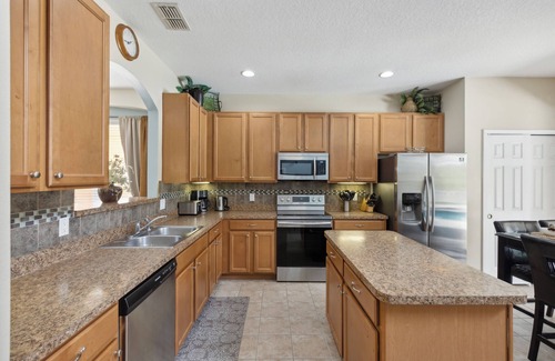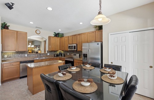 The kitchen comes complete with modern appliances, cookware, and utensils. Whether you're preparing a quick breakfast before heading to the theme parks or cooking a family dinner, you'll find everything you need to make and enjoy a delicious meal during your stay. Enjoy the convenience and flexibility of having a home-cooked meal away from home. Just off the kitchen there is a cozy nook with breakfast table and 6 chairs, the perfect setting for a casual breakfast, or savouring your morning coffee as yo plans the day’s adventures. From the kitchen there is a patio sliding door that leads to the sun drenched pool area.