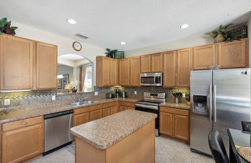 This villa enjoys two spacious living areas, both which to relax and unwind after your hectic day at the theme parks. Experience ultimate relaxation in the luxurious and comfy main living room. Sink into plush sofas, unwind in front of a state-of-the-art entertainment system with 65” 4k Smart TV, and enjoy the elegant decor that exudes comfort and style. The main living area is part of the sociable open plan living space, sharing the area with the kitchen. The more formal living area is located at the front of the property and is there perfect place to escape to have some quiet time to switch off, or read a book. Both living rooms provide the perfect setting for a truly rejuvenating stay in Orlando, Florida.