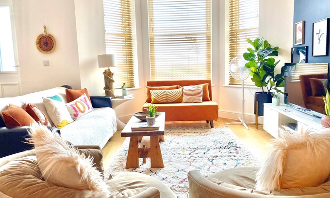 Imagine a stylish open-plan living area where comfort meets chic. Whip up a feast in our fully equipped kitchen with high-end appliances. Perch on bar stools at the cosy breakfast bar with lobster pot lights, perfect for pre-dinner drinks. Gaze through tall sash windows offering stunning sunsets and sea views. Enjoy free parking and sleep blissfully in luxurious hotel-quality beds, perfect for longer stays. Indulge in 5-star luxury at this Ibiza-style coastal paradise, a few minutes' walk from Worthing Pier and many restaurants and activities.