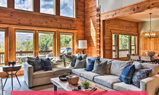 Enjoy a picture-perfect mountain getaway at Apple Cove Lodge, a luxurious escape with a rustic aesthetic near Grandfather Mountain State Park. Make unforgettable family memories in this stunning space while enjoying the hot tub, game room, cozy fireplace, and epic views of the Blue Ridge Mountains from the wraparound deck.