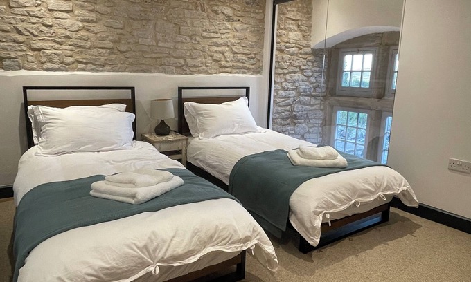 Upstairs, the solid oak staircase leads to two charming bedrooms: a double and a twin, both featuring exposed stone walls. While children are welcome, please note that the open-tread staircase and glass balustrades may make the Chapel less suitable for toddlers, as stair gates cannot be securely fitted.