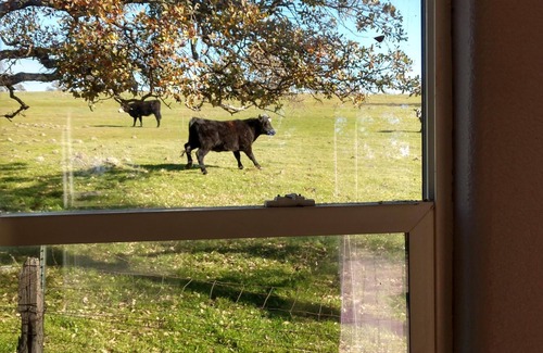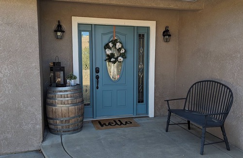 Our home is on five acres, surrounded by cattle ranches, rolling hills of green or amber, and other idyllic rural scenes. Being up on a small incline, the highlight of the property may be the view of the ranchland below, framed by distant hills. On a clear night, the lights of Stockton and Sacramento dot the horizon, and on a very clear day, Mt Diablo is visible, standing at attention in the distance. Certainly, the outdoors - where often the only sounds one hears are the singing of birds and the lowing of cows - is a major feature of this property, and with that in mind, we've created numerous sitting areas to take it all in. The deck overlooking the pastures beneath is one of our favorite spots, as there's almost always a refreshing breeze wafting up from the hillside below. Other relaxation areas include chaise loungers to work on your tan, a swing bench made of Montana pine wood to view our developing flower garden, padded reclining chairs around a gas fire table, a beckoning hammock stretched between two oaks, and another seating area on the large back deck of the house - perfect to keep company with the one manning the barbeque.