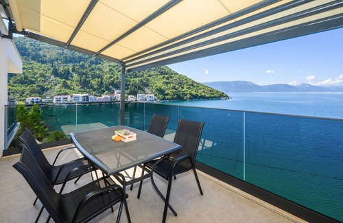 You can hardly get closer to the water than in this beautiful vacation apartment with a magnificent panoramic view directly on the sea. Spend a wonderful time with your family or friends in this modern and stylishly furnished accommodation. From the balcony you have a fantastic view of the coast. Have a revitalizing breakfast here while you plan your day, or enjoy a delicious glass of wine spritzer and marvel at the natural spectacle of sunsets over the water. Immediate refreshment is provided by the on-site pool and the interiors also offer a pleasant temperature with air conditioning in any season.