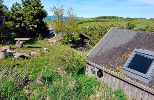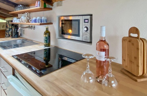 Your rustic tiny house is the ideal retreat for couples or small families looking for peace, views and closeness to nature. The elevated position offers a fantastic panoramic view over the countryside to the sea. Enjoy the light-flooded living area with open beams, large windows and direct access to the greenery. Take a seat at the dining table and gaze out over the expansive natural surroundings as you enjoy your breakfast. Make yourself comfortable in the reading corner or relax by the wood-burning stove in the evening. The open-plan kitchen is functionally equipped and offers you the opportunity to cater for yourself.