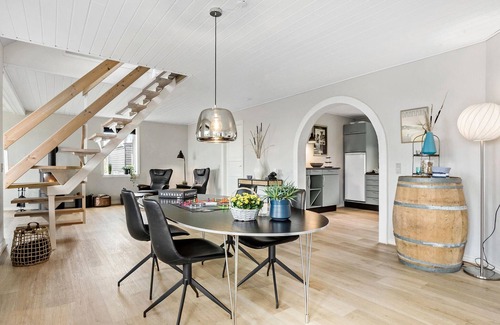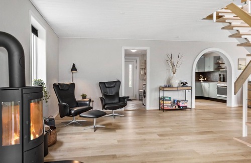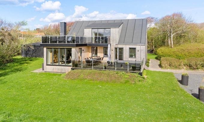 In your spacious vacation home on the beautiful Venø Bay in the Limfjord, coziness and comfort are paramount. The large windows offer a view of the fjord. There's plenty of space in the elegant kitchen to prepare a delicious breakfast for your family in the morning. You can then discuss the day's plans at the long dining table while enjoying the beautiful view of the water and the wood crackling in the wood-burning stove. The spacious sofa and the many other seating areas also ensure warmth and conviviality. Spend time together here, play card games or browse through a book. The fresh Danish air awaits you right outside the front door. Enjoy a cup of tea on one of the house's spacious terraces. The large lawn invites you to play outside. Play a game of kubb and then follow the green path that leads you directly to the coast.