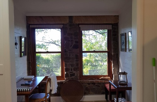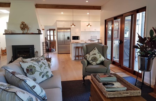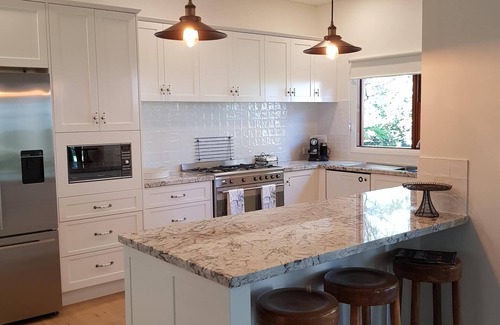 A pastoral haven commanding both country and ocean views across the dairy, surrounded by magnificent old Morton Bay Fig Trees, Stony Hill Cottage is a charming country home found down the end of a private road. The kitchen is beautiful and fully equipped for a very comfortable stay and the open plan living has a comfortable sofa, two wing chairs and an excellent LG Smart TV with unlimited WIFI. There is a sound bar both upstairs and downstairs. It is an ideal place to relax and unwind in either summer or winter, with a lovely fireplace, which keeps the home cosy and warm. It has a separate studio and is set on the hilltop amidst prime dairy country. It was originally a farmworkers cottage on the dairy and has been expanded over the years. The newly renovated home has an extra upper level with huge master bedroom and ensuite plus study. There is an expansive deck upstairs commanding magnificent 270 degree views. Downstairs there are two queen rooms and one twin room, with king single beds. There is a log fire and wood is provided. It is a mere 5 minutes drive to famous Mollymook and Narrawallee beaches and a short walk to the historic town of Milton, so you can choose between coastal, country or cultural pursuits whilst enjoying the feeling of being tucked away from the hustle bustle. Milton is a lovely, historic town with interesting and quirky boutiques, some excellent restaurants and lovely surrounds. Being close to both Mollymook and Narrawallee you have the benefit of both country and coastal pursuits.