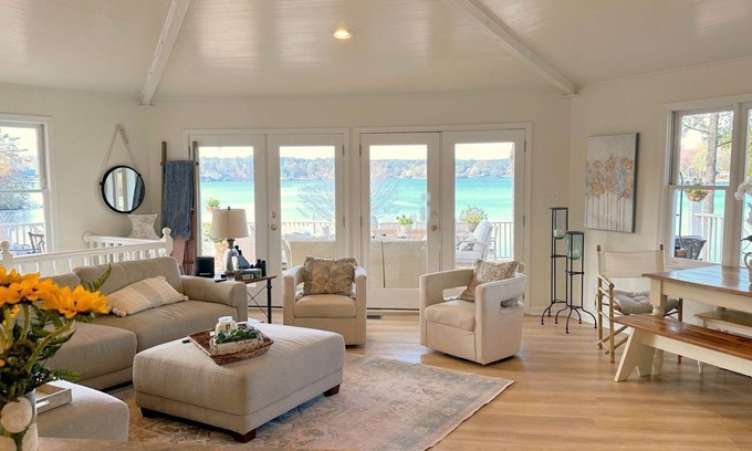 The flat grassy yard is great for kids to play on and there is a hammock nestled under a large shade trees near the water’s edge. The dock has a large swimming platform, gas fire pit and lounge chairs to sunbathe, relax and fish. 5 kayaks and 2 paddle board are available for your use.