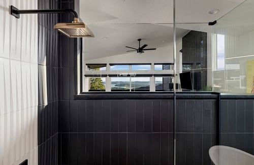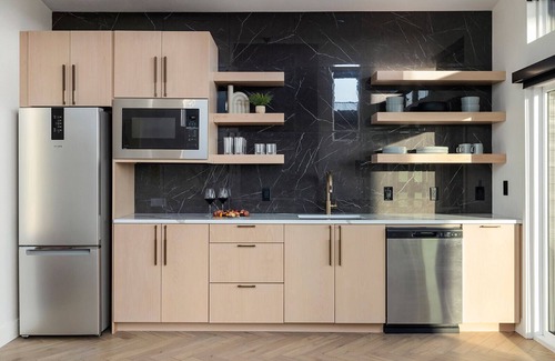 Recharge in the lavish king-sized bed, and at night, effortlessly lower the blinds with the touch of a remote. Refresh in the spa-inspired bathroom, complete with a deep soaker tub for two, creating the perfect atmosphere for relaxation. While the treehouse is equipped with dining essentials, including a fridge, microwave, coffee maker, and dishwasher, it does not feature a stove or oven for cooking.