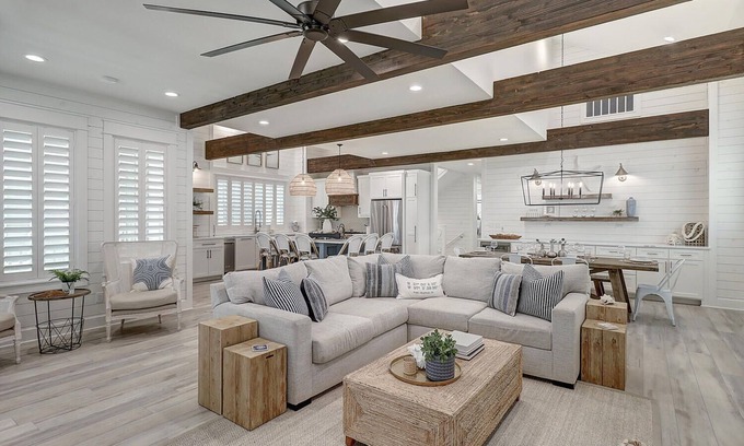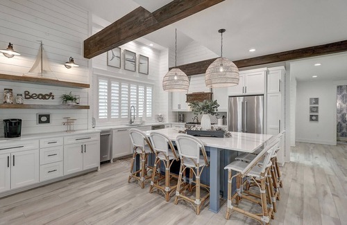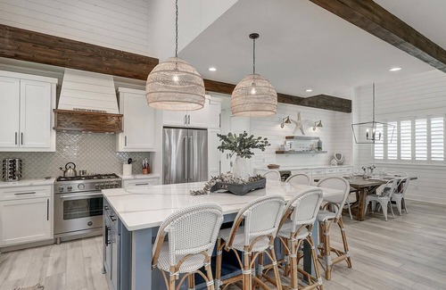 MAIN LIVING SPACE: Located on the second floor to take advantage of views, the open-concept living area where your family will spend most time together feels spacious and relaxing. Handsome wood ceiling beams accent the all-white space wrapped in shiplap and lined with shutters. Cozy up in front of the fireplace. Sink into the sectional sofa in the family room, play games at the large dining table, which seats eight. A wrap-around island frames the kitchen, where the cook in the group can still visit with everyone. You’ll love using the two beverage bars, whether you serve juices for morning brunch or a cocktail party at sunset.