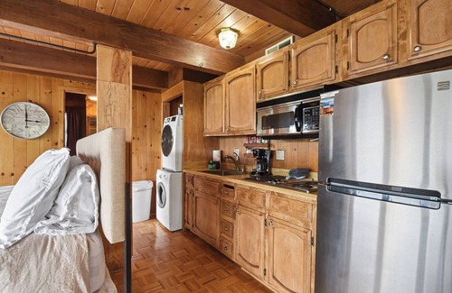 Past the bed is a kitchenette equipped with a refrigerator, stove, and microwave. These essentials are everything you will need to whip up a delicious meal. The tall dining table has 2 bar stools for you and your guest to dine over a home cooked meal together. A washer and dryer are also located off of this area, suitable for wet swim suits after a trip to the lake.