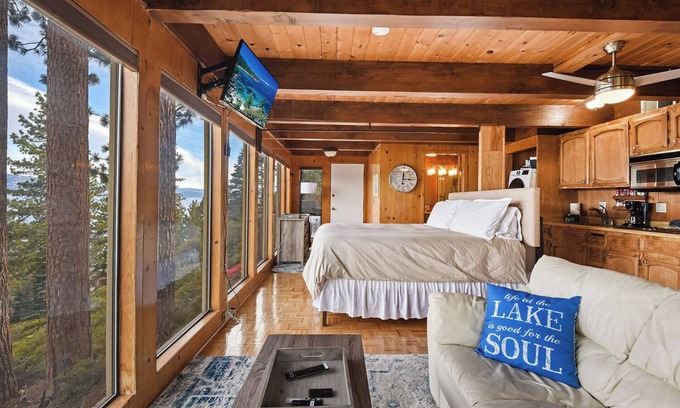 Enjoy a getaway to Crystal Bay in North Lake Tahoe. This lakefront studio is the perfect accommodation for a couple looking to escape and enjoy breathtaking views of the lake. The unit is conveniently located at the lakefront, offering easy access to its sandy shores. Guests will also find themselves just down the street from trailheads, and a quick car ride away from restaurants, north lake casinos, including kings beach, and incline village. The local TART bus picks up in front of the house, so you can take a quick trip down into Kings Beach, or any of the North Lake stops, worry-free from the hassles of driving or parking if you wish. In the wintertime, local ski resorts offer free shuttle service and will pick you up if you arrange ahead of time.