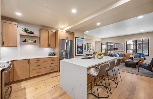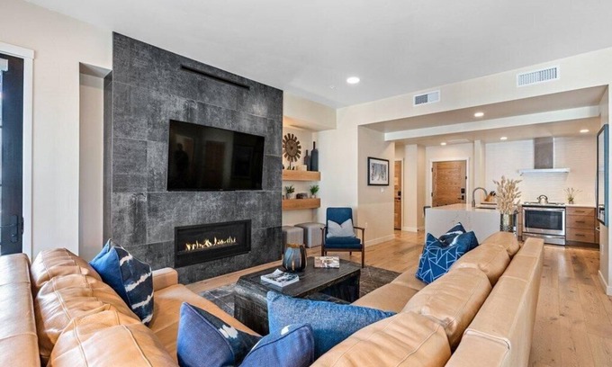 Enjoy the stunning views of the mountain while taking in the vibes of the Village Plaza from this spacious 2-bedroom, 2-bathroom ski-in/ski-out condo. This condo has everything you're looking for in your mountain stay! Relax by the cozy modern linear gas fireplace in the large living room after the day's adventures or cook and entertain in the beautiful kitchen that features quartz countertops, stainless steel appliances, and is fully stocked with everything you need.
