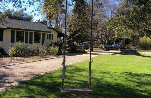 Enjoy a glass of Mesa Del Sol wine while you take in magnificent views in every direction of the winding Arroyo Seco River and surrounding mountain wilderness. Guests are welcome to collect fresh eggs daily from our chickens and harvest from the organic garden and numerous fruit trees. Kids can run free on the expansive green lawns, bring their own floats to splash in the pool, swing to the heavens from the 300-year-old oak tree swing or toddler swingset, and watch the wildlife at every turn. The whole family can try their skills in a competitive game of basketball, volleyball, croquet, and even (faux) ax throwing.