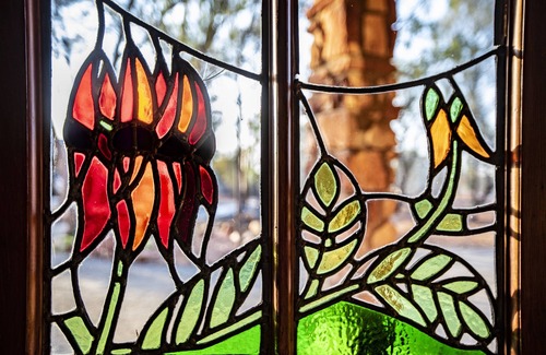 Multiple leadlight windows showcase the Sturt’s Desert Pea flower.