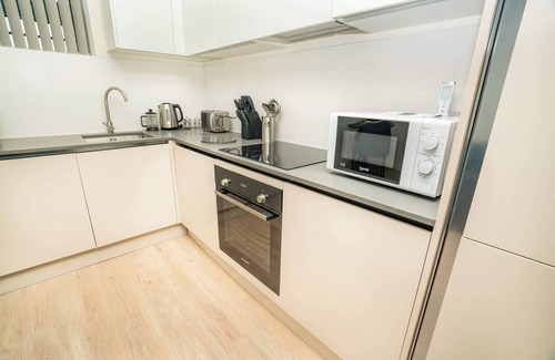 The modern interior has been finished to a high standard and features comfortable furnishings, contemporary fixtures and fittings and more than enough space for 2 guests to enjoy a comfortable stay. The bright open plan living space comprises a modern fully equipped kitchen with everything you need to cook your own meals at home, a snug sofa, armchair and a smart TV. There is high speed broadband throughout the apartment. The generous double bedroom features plenty of storage space for clothes and a comfortable bed with crisp hotel linen. The modern bathroom has a rainfall shower, toilet and sink as well as complimentary toiletries with fluffy towels for your use.