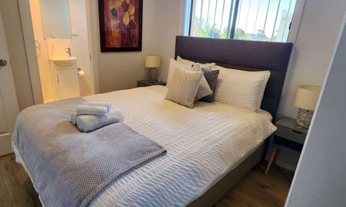 Spacious 60 sqm two-bedroom granny flat in the CBD, featuring reverse air conditioning, two bathrooms, and a fully equipped kitchenette. Enjoy the convenience of free parking for one car on the premises, plus additional free street parking.