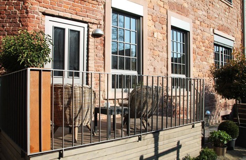 Stylish design studio with old belly arms, parquet floorboards, high stucco ceilings, open sandstone wall and green courtyard. Fully equipped kitchen, luxury bathroom, King Sized bed, W-Lan, LED TV, Workspace, private terrace with seating.