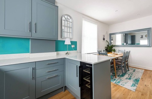 The stylish top-floor apartment features a newly fitted kitchen, inviting dining area, and a separate reception room with original bay windows, comfortable sofas, and a large smart TV. Three spacious double bedrooms (one queen, two doubles) comfortably sleep up to 6 guests, with fitted wardrobes and a Juliet balcony in one room. Both bathrooms are modern, both fully refurbished in 2024.