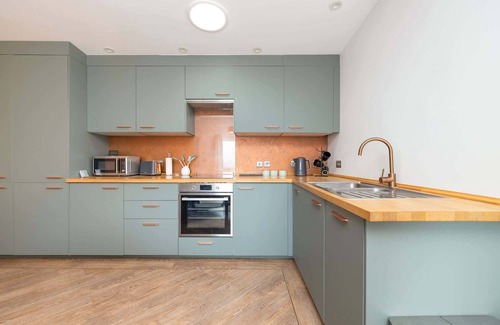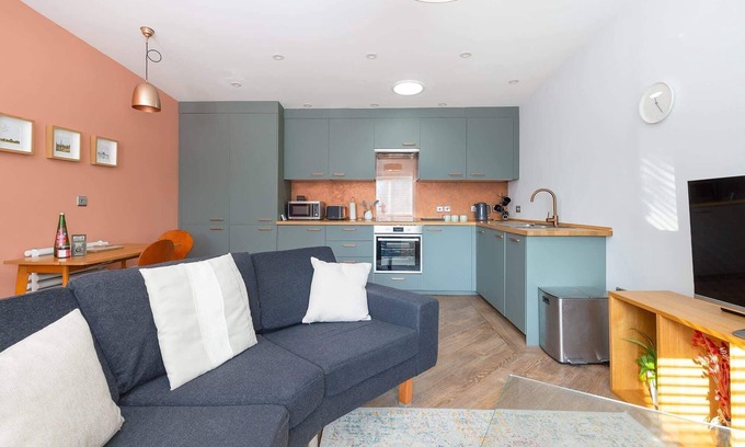 Distinctly modern but with a retro edge, the open-plan living room and kitchen provide plenty of comforts. Snuggle up on the sofa on cooler evenings to a film on the smart TV, or take to the terrace when the sun shines. There are beautiful views out over the surrounding countryside and distant hills. The bedroom boasts plenty of storage space so you can really make yourselves at home, meanwhile, a contemporary bathroom features a shower and luxurious double sink. With free private parking on the drive, you can ensure a stay that’s easy and effortless.
