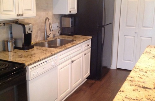 *Fully-equipped kitchen with granite countertops. Electric range, microwave, dishwasher, and refrigerator. Small appliances included, along with dishes, utensils, and pots/pans.