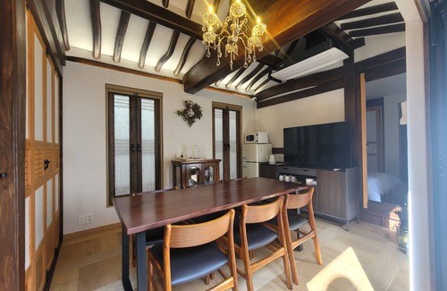 It is a traditional hanok with a spacious living room, a dining table for six, and an all-modeled kitchen and bathroom.