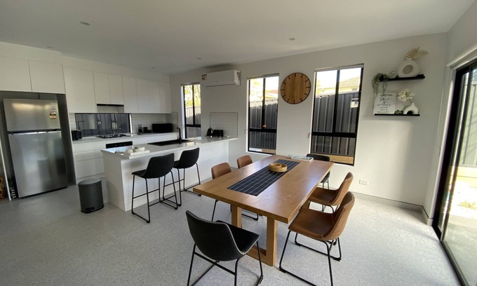This cozy vacation home is perfect for families. The property offers an open plan living area, a fully equipped kitchen with a gas cooktop and a dishwasher, and a dining space on the ground floor that is air-conditioned. Upstairs, you will find three bedrooms, each furnished with a comfortable queen bed. All of the bedrooms are equipped with ceiling fans and built-in wardrobes. The bathroom is designed with convenience in mind, featuring a bathtub, shower, and toilet. For added convenience, there is a laundry room with a washing machine, and a driveway where you can park your car. In addition, the home is equipped with WiFi, allowing you to stay connected throughout your stay. Furthermore, its central location provides easy access to numerous nearby attractions that you can explore on foot.