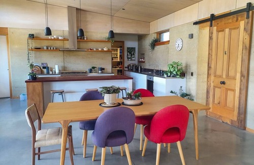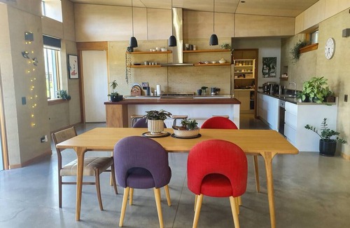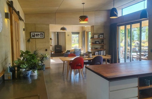 Kick back and relax in this calm, stylish space. This rammed earth house is situated on an acre section at the end of a private lane making it a peaceful getaway with plenty of space for the whole family. There are three bedrooms with double/queen beds, two bathrooms and a seperate lounge which has the option of two rollaway beds for additional sleeping space. The main living is open plan kitchen/dining/lounge with a log burner.