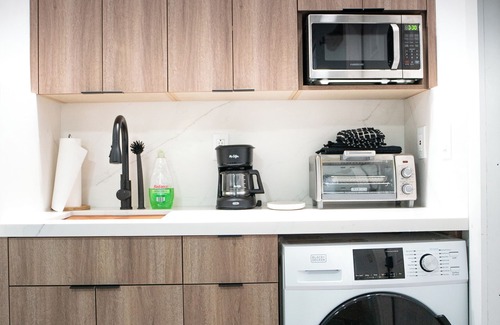 The kitchenette has a mini oven, coffee machine, electric burner, and washer & dryer. Desk, high-speed internet, beach chairs, umbrella, mat, resistance bands, and snacks included.