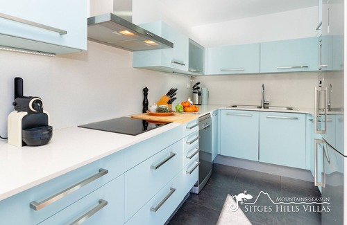 Villa Solaris - managed exclusively by Sitges Hills Villas, is newly built to a high standard and is ultra-modern in design. It also enjoys an elevated position in Mas Mila, just a 12-minute drive to Sitges.A spacious outside area featuring a private pool offers wonderful views over the surrounding hills and vineyards. This is a high quality holiday contemporary design home that has been meticulously built to the highest specifications and thoughtfully designed to take full advantage of its privileged position.The extensive use of glass in the design means that every room in Villa Solaris is full of light and enjoys panoramic views across the hills of the Garraf Natural Park. The decor is both modern and stylish, with high quality furnishing and attractive parquet floors throughout.Villa Solaris is arranged over 3 floors as follows;GROUND FLOOREntry to Villa Solaris is either via the ground floor or the top floor. The ground floor features a spacious open-plan living and dining room that has large windows overlooking the terrace and pool area. The living area is stylishly furnished with a large comfortable sofa and 3D TV, DVD Blue Ray and IDOCK with good lighting that creates the perfect ambiance for your holiday.The living area enjoys wonderful views over pine covered hills and lush vineyards. The dining area is spacious and includes a dining table that comfortably seats 8 guests.The kitchen is to the left of the dining area and is fully equipped with all appliances, including oven, microwave, 4-ring hob, fridge-freezer, nespresso coffee machine, kettle and everything else necessary for your stay. The kitchen opens out directly to the terrace and pool area.FIRST FLOORThe first of the bedrooms is located just a few steps up from the living area. This is the master suite with floor to ceiling windows that frame the panaromaic views across the hills. This bedroom features a balcony with comfortable seating that overlooks the pool and terrace area.TOP FLOORThe top floor of the villa is home to a further 3 bedrooms, all tastefully furnished and with a large shared family bathroom. Villa Solaris can sleep up to 8/9 people in 4 bedrooms arranged as follows;BEDROOMSBedroom 1 - Master ensuite with desk, built in wardrobe and terrace with views. Bedroom 2 - Large double, built in wardrobes & terrace with stairs leading to a terrace and pool area. Bedroom 3 - Twin beds with small wardrobe, extra Zbed can be added to sleep 9.Bedroom 4 - Twin beds with small wardrobe.BATHROOMSBathroom 1 – Large shower, washbasin, bidet & toilet.Bathroom 2 – En-suite, jacuzzi bath with shower, washbasin, bidet & toilet.Bathroom 3 – Toilet & washbasin on ground floor.TERRACE AND POOL AREAThe centrepiece of the gardens is a fantastic 8m x 4m swimming pool (with optional pool heating from 280 Euros) that offers wonderful views across the hills. The attractively tiled pool area provides plenty of room for sunbathing and relaxation. Directly outside the kitchen area is a large dining table comfortably seating 10 guests and a BBQ for outdoor cooking. There is also a very cool lounge area with plenty of comfortable seating for relaxing.There is an additional terrace that is accessed from the double bedroom on the top floor, this terrace offers further space for enjoying the sun and relaxing whilst admiring the beautiful views.The rest of the gardens that surrounds the villa have been left in their attractive natural state consisting of limestone rocks interspersed with aromatic Mediterranean herbs and palms.There is secure off-street parking for 2 cars at Villa Solaris. There is also unlimited and free on-street parking at the front and back of the villa and no permits are required.The Sitges Hills Villas team are available during your stay, should you need us.Prices do not include tourist tax of 1.00 € / person / day.