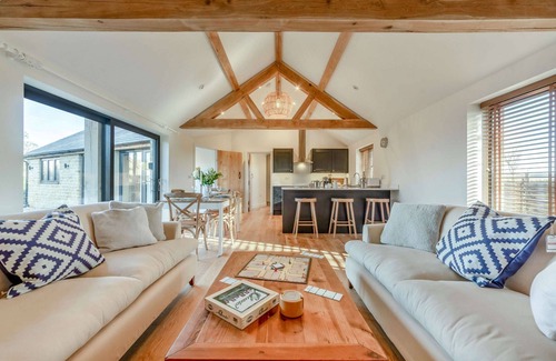 Spacious open-plan layout with vaulted ceiling, exposed oak beams, exposed stone feature wall, two three-seater sofas, three stools, dining table with four chairs, bookcase containing an assortment of board games and wall-mounted Smart TV (account holders only)