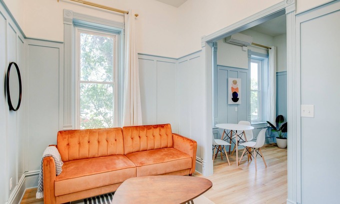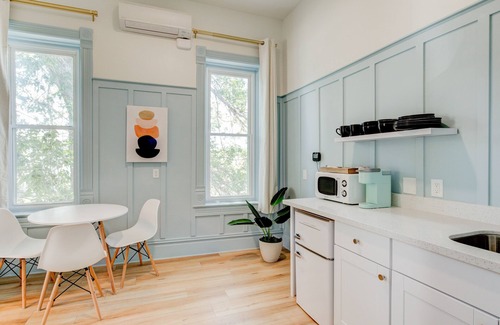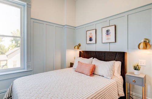 Dreamy, baby blue Suite 3 has gorgeous 10-foot ceilings and natural light on the east, south, and west sides. Originally the space was split into multiple rooms—in the hallway outside the suite you will notice a pair of historic doorframes. Now it is beautifully fresh and open, the perfect haven for a romantic getaway or a family retreat.
