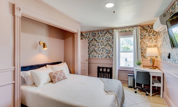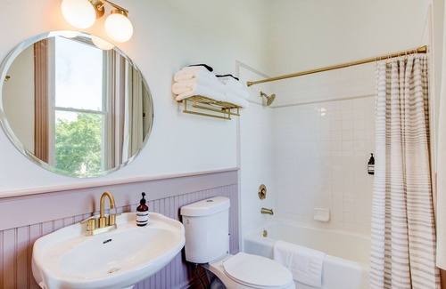 Cozy yet elegant, Suite 4 has stunning vintage wallpaper with furniture to match. Because the bathroom was part of the 1892 brick block and the bedroom was part of the 1910 addition, the ceilings are different heights: the bedroom has a cozier 8-foot ceiling and the bathroom has airy 10-ft ceilings.