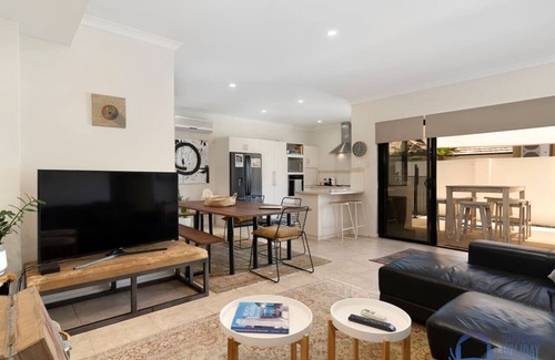 The home is spread over two levels. While the address is Westview Parade, the house runs the full depth of the block and the garage is accessed on Village Mews, a quiet cul-de-sac. Downstairs is the open plan kitchen, dining, and living area which is tastefully furnished and air-conditioned. There is a modular leather sofa and smart TV in the living room, with a dining suite that seats 6. The kitchen is off the dining area and is well-equipped, including a dishwasher, microwave and coffee pod machine. It looks out to the alfresco covered outdoor patio with a further dining suite and a BBQ and the gated spa. Spend your evenings out here, enjoying the spa while you fire up the BBQ.