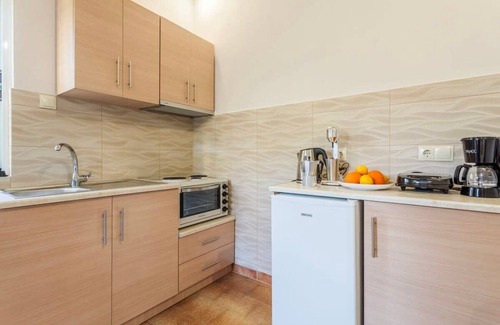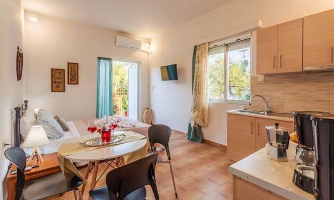 A modern studio, tastefully decorated, fully equipped, offers all the comforts for enjoyable holidays. Equipped with a big and comfy double bed which has direct view to our full of flowers garden. Our spacious room is fully air conditioned and bright. There is a TV and a fully equipped kitchen in which you will have all the essentials to prepare your meals with local products. The spacious and always clean bathroom is equipped with a shower. Finally you can relax in our garden, while enjoying the mountain view and the quiet area the property is located.